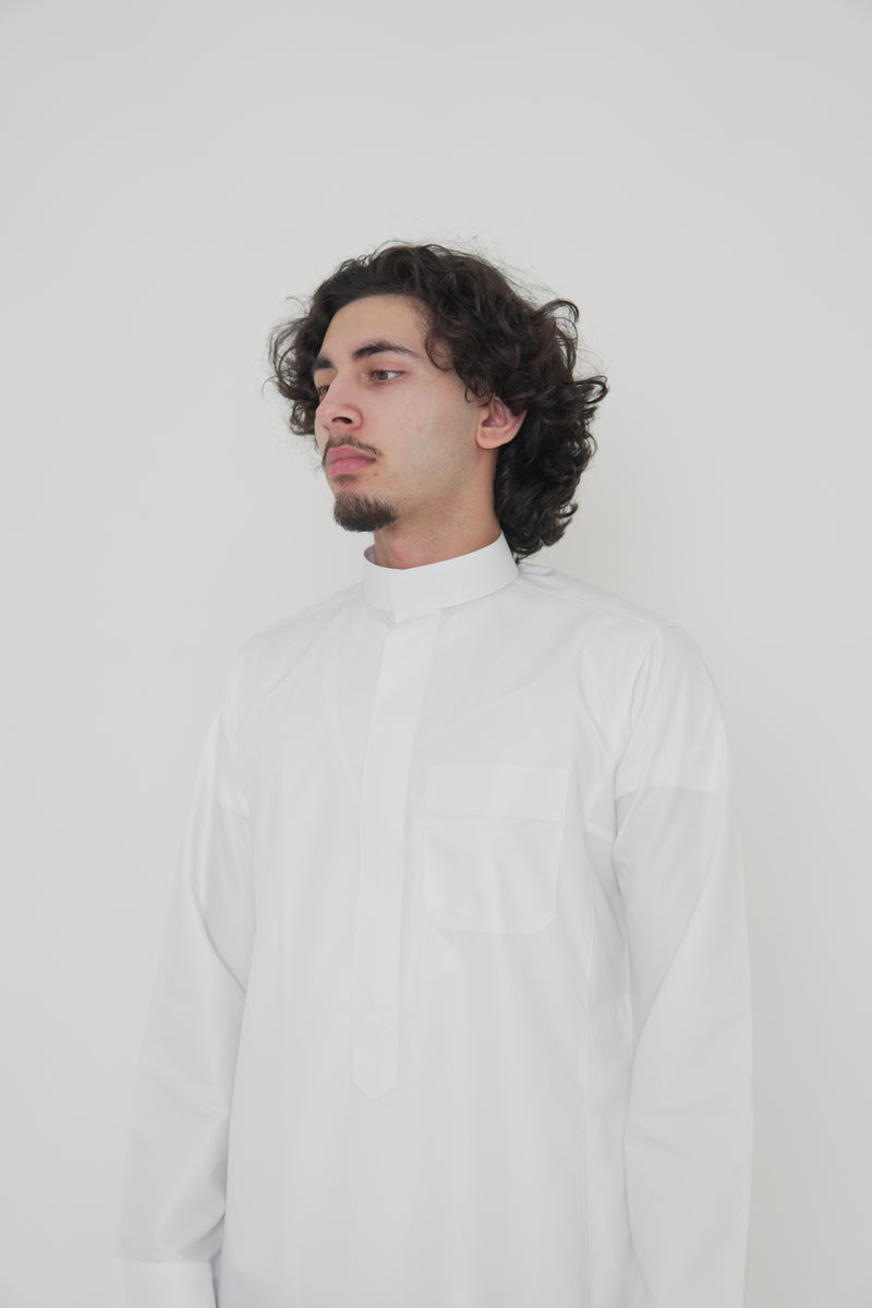 The White Collared Saudi Thobe is one of the core pieces of our new launch — a true staple of YAZIR.